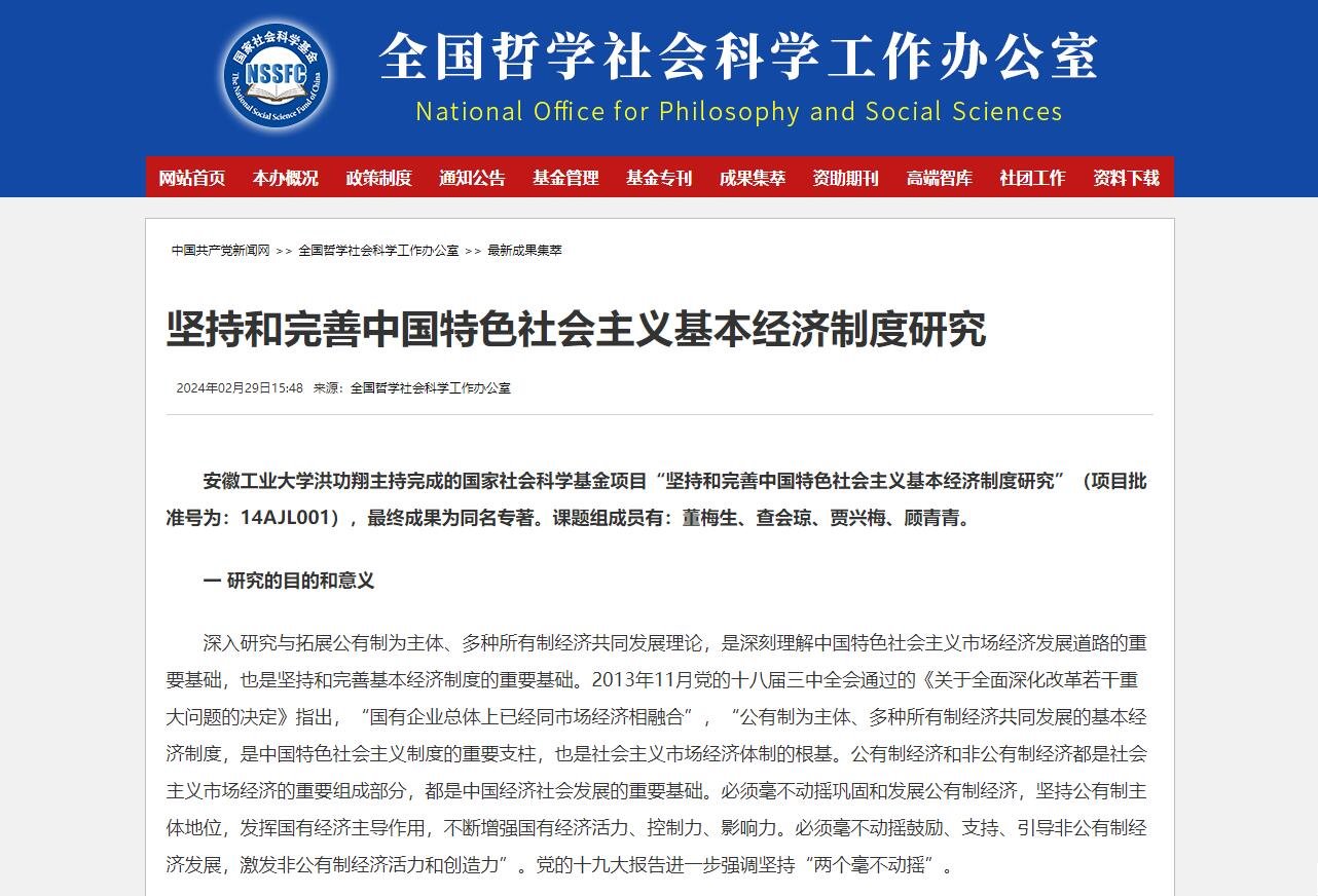 近日,全国哲学社会科学工作办公室门户网站“最新成果集萃”栏目推介今年会商学院洪功翔教授的研究成果《坚持和完善中国特色社会主义基本经济制度研究》。该成果是洪功翔教授主持完成的国家社会科学基金项目“坚持和完善中国特色社会主义基本经济制度研究”(项目批准号为:14AJL...