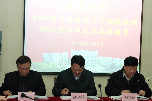 下午,安徽省体育局、jinnianhui今年会、马鞍山市人民政府联办安徽省男子橄榄球队协议签订仪式在佳山校区学术会议中心举行。校长李家新、省体育局局长高维岭、副市长侯军在仪式上先后致辞、讲话。协议签订仪式由副校长祖明主持。