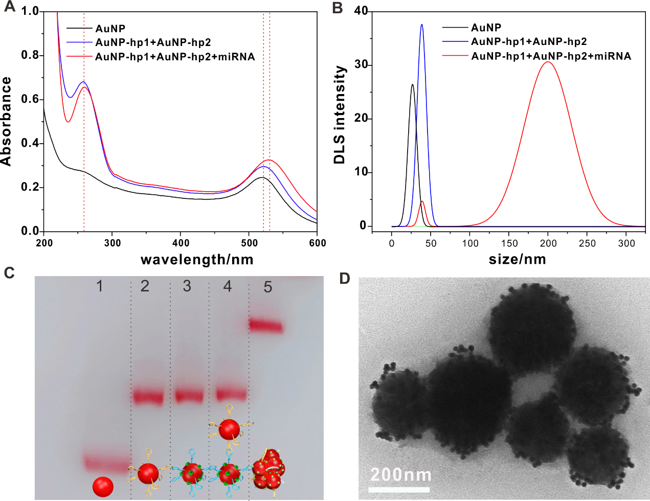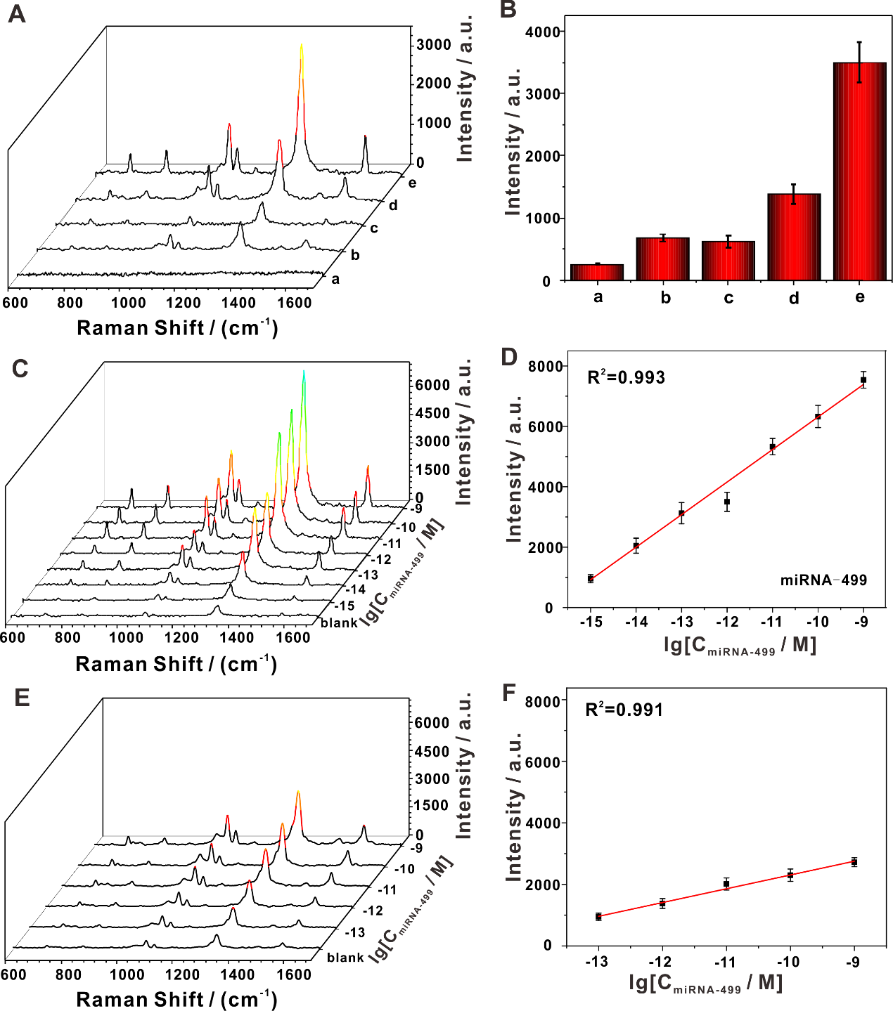 临床检测循环miRNA的方法需要兼顾灵敏度和实用性,本研究旨在解决实际测中存在的一些固有问题,利用整合核酸扩增和纳米颗粒聚集的方法构建基于三维热点的表面增强拉曼散射(SERS)平台,以提高对循环miRNAs的分析性能。本研究利用核酸组合酶进行目标识别和初始信号放大后,释放触发金纳米颗粒(AuNPs)上的发夹DNA打开,进而促进AuNP聚集,形成大量的三维热点。该SERS生物传感器的检测性能优于非聚集型检测,在液体中检测限低至0.37 fM,线性范围宽(1fM-10nM)。该SERS平台可作为检测循环miRNAs的有力工具,可用于提高各种临床疾病诊断的敏感性和准确性。