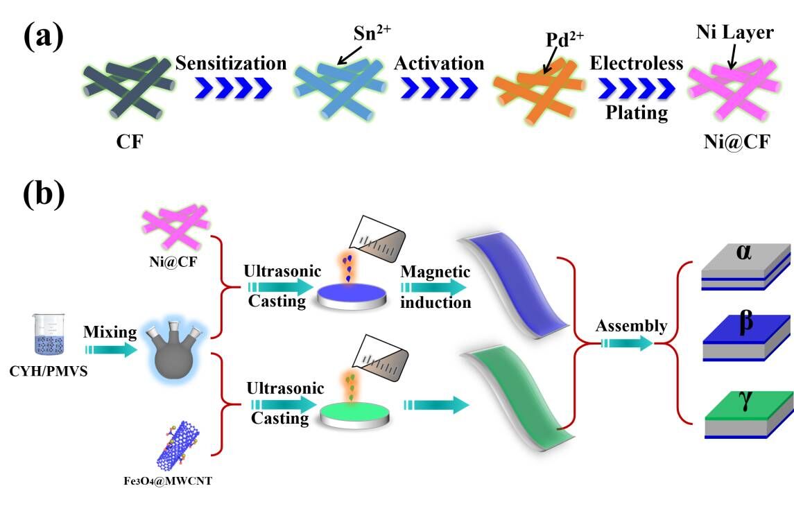 本研究通过磁场诱导以及填料的核壳结构设计构建了具有选择性吸收和高屏蔽特性的柔性硅橡胶/Ni@CF/Fe3O4@MWCNT复合材料。结果表明,在磁场条件下,Ni@CF能够有效地富集在硅橡胶基体底部,从而形成密集的搭接网络,展现出优异的电导率及电磁屏蔽效能。电磁波在屏蔽层间的多次吸收反射有效增强了复合材料的电磁屏蔽效能,通过改变层间距能够有效地调控材料的屏蔽增强峰。由入射和反射电磁波共振削减而形成的选择性吸收峰进一步增强了材料的吸波效率,多次反复弯曲后硅橡胶复合材料还能维持优异的屏蔽效能和吸波特性。该研究为高性能电磁屏蔽复合材料的制备及性能研究提供了一种新的思路。