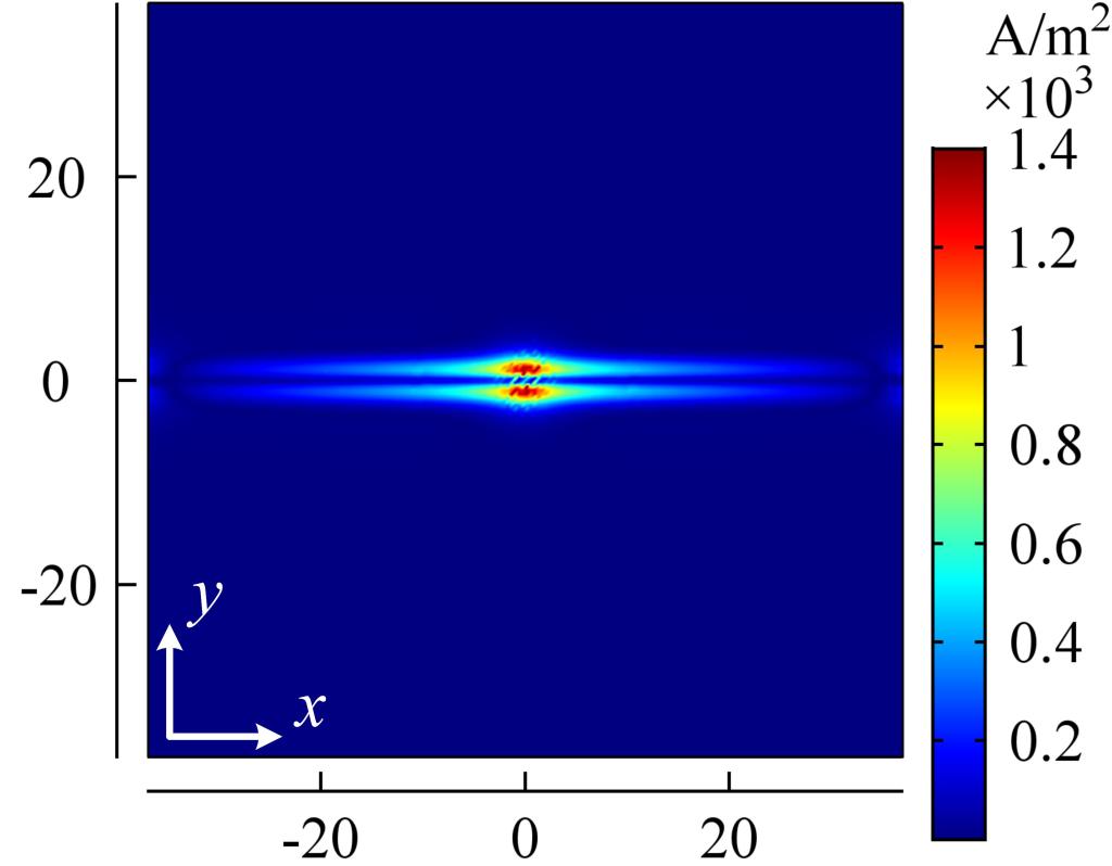 (电流密度|J|在碳材料(左)、CFRP单向板(中)和CFRP正交板(右)x-y面内的分布情况)