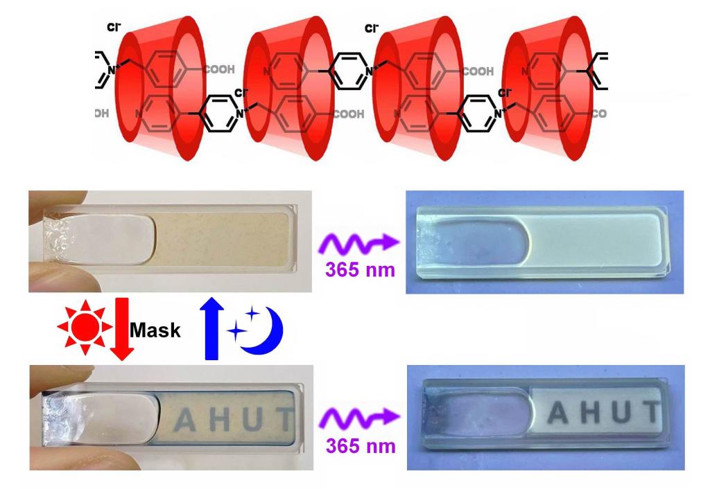 近年来在各种刺激响应材料中,一些光致变色材料在光照射下发生醒目且可逆的颜色变化引起了广泛的关注。光致变色材料的优势在于材料颜色变化是可视的、可逆的、便于监测的,因此光致变色材料在信息存储、智能玻璃、装饰、显示器、传感器、可擦无墨印刷、防伪等领域得到了广泛的应用。到目前为止,已经发展出多种有机光致变色材料,包括二苯乙烯类、偶氮苯类、螺吡喃类、螺噁嗪类、俘精酸酐类和席夫碱类,这些光致变色家族在其光致变色过程中通常以结构顺反异构化或键的裂解与形成为主要特征。与其他有机光致变色家族相比,N、N’-取代4, 4’ -联吡啶(紫精,V2+)化合物具有独到的优势,它们在固态下光照变色过程不涉及分子几何结构的破坏,其原理是光照后,紫精通常通过电子转移产生自由基(V•+),颜色加深。