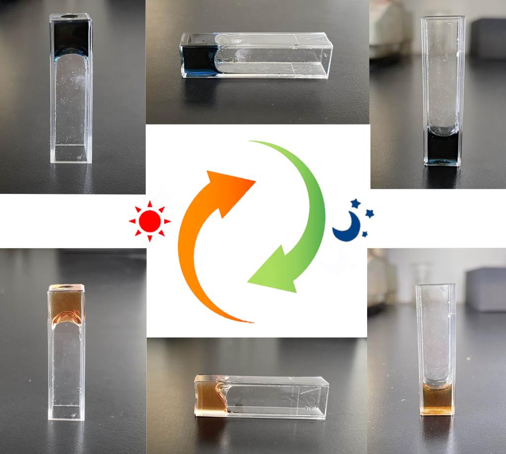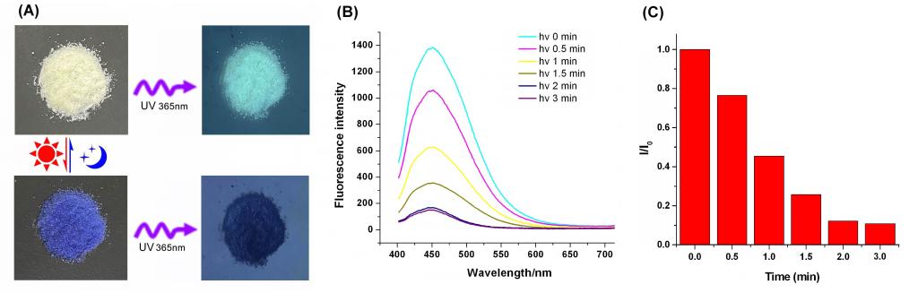课题组将单边甲基苯甲酸取代紫精与γ -环糊精通过π-π相互作用和主客体自组装作用形成一种新型超分子水凝胶。这种超分子水凝胶在阳光照射下的颜色变化由浅黄色变为深蓝色。ESR实验证实,超分子水凝胶的光致变色源于自由基的产生,这些自由基源于光诱导电子从主体γ- CD转移到客体分子上,核磁表征结果证明了主客体的包结比模式为1:1。不仅如此,该超分子水凝胶在紫外光照射下表现出荧光发射,并在光辐射下产生荧光猝灭,意味着荧光强度可以通过光辐射时间被可逆地调制。固态荧光测试实验结果证明随着光照时间的增加,主客体包结物的荧光不断减弱,荧光猝灭率达到90%。基于光致变色和荧光可调特性,这种超分子水凝胶可作为视觉显示和防伪材料,本研究为一种具有光致变色和荧光特性的功能性水凝胶拓展了方向。