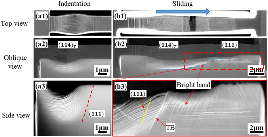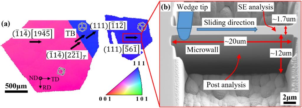 研究人员利用聚焦离子束技术(FIB)在奥氏体不锈钢的单个晶粒内部和含有孪晶界的双晶(bi-grains)上制备出了一系列的微墙,其宽度约为1.7µm、长度约为20µm、深度约为12µm。之后,使用尖端半径为5µm的楔形压头在非原位纳米压痕设备KLA G200上进行了划痕实验。经过对划痕试样的表征与分析,发现在单道次微墙划痕实验中出现了宏观实验中类似的位错墙,充分地验证了新设计的微观摩擦实验方法的可行性和合理性。此外,实验的研究成果表明:位错墙的形成和长大行为取决于摩擦方向(晶粒取向和划痕方向);细小晶粒在位错墙处形成;孪晶界强烈地影响位错墙行为,并改变孪晶界附近的局部塑性。研究成果不仅为提供微型元器件减磨耐磨性能设计奠定理论基础,深化了对工程金属宏观摩擦磨损的基本认识。