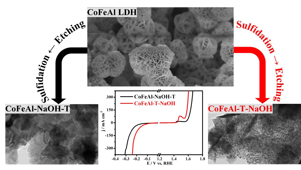 团队通过硫脲-NaOH的处理方法在CoFeAl LDH上制备出由金属硫化物组成的多孔结构CoFeAl-T-NaOH电催化剂。结果显示,硫脲和NaOH处理的先后顺序不同使得催化剂在形貌结构和电催化活性方面存在差异,CoFeAl-T-NaOH电催化剂具有优异的OER、HER、OWS和稳定性。多孔异质结构促进了反应物的运输和产物的扩散,金属硫化物异质结加快了电荷的迁移。相关成果发表在中科院一区TOP期刊《Nanoscale》(IF: 8.3),邓小龙副教授为第一作者和通讯作者,曹加锋副教授和济南大学黄金昭教授为共同通讯作者。研究工作得到安徽省自然科学基金、安徽省高校自然科学研究等项目的资助。