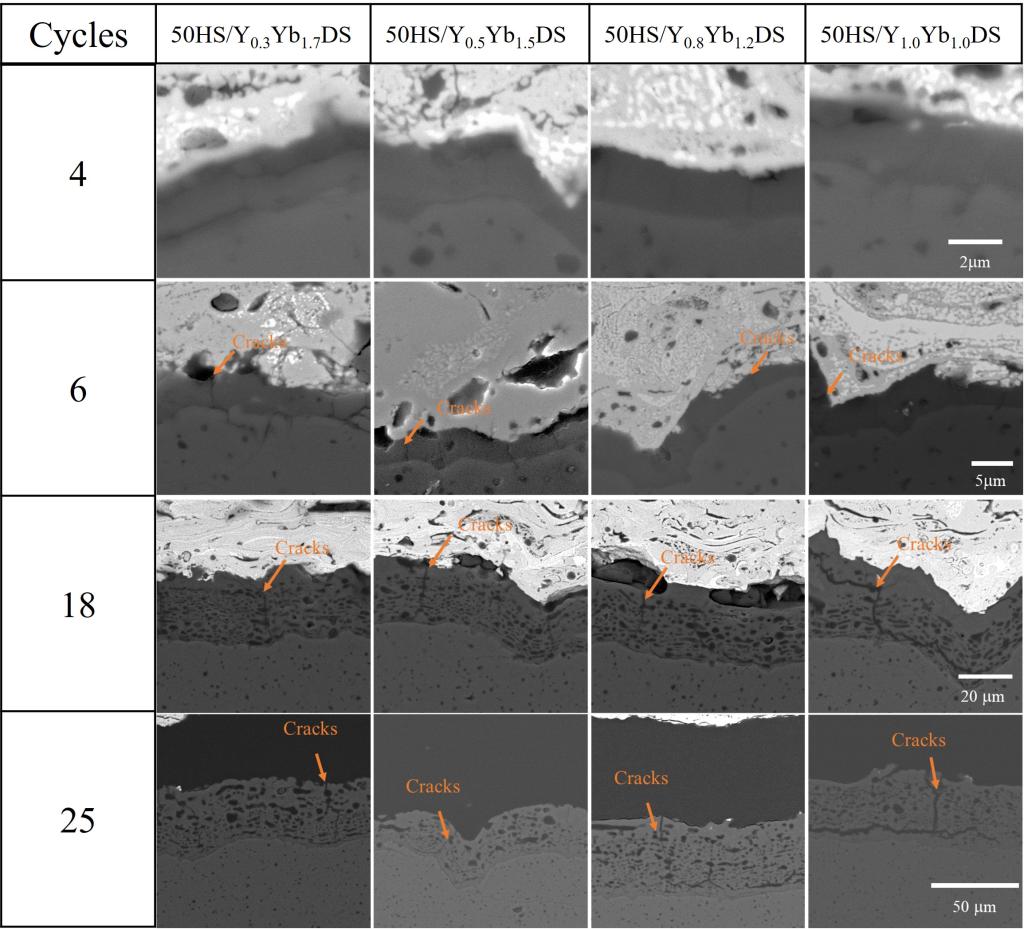 团队利用大气等离喷涂技术在SiC表面分别喷涂了粘结层和顶层的TEBC,研究了TEBC样品在1475℃90%H2O-10%O2环境中服役行为,总结了TEBC样品在服役环境中的结构演变规律,阐明了热生长氧化物的生长机理、失效模式和机理等。研究工作表明,此项技术可以在1475℃ 90%H2O-10%O2环境中为SiC基体提供有效的防护,提高了TEBC的服役温度和使用寿命,为TEBC在超高温环境中的服役提供了一种新的思路和方案,对提升航空装备的综合性能和促进“两机”的发展具有战略性意义。