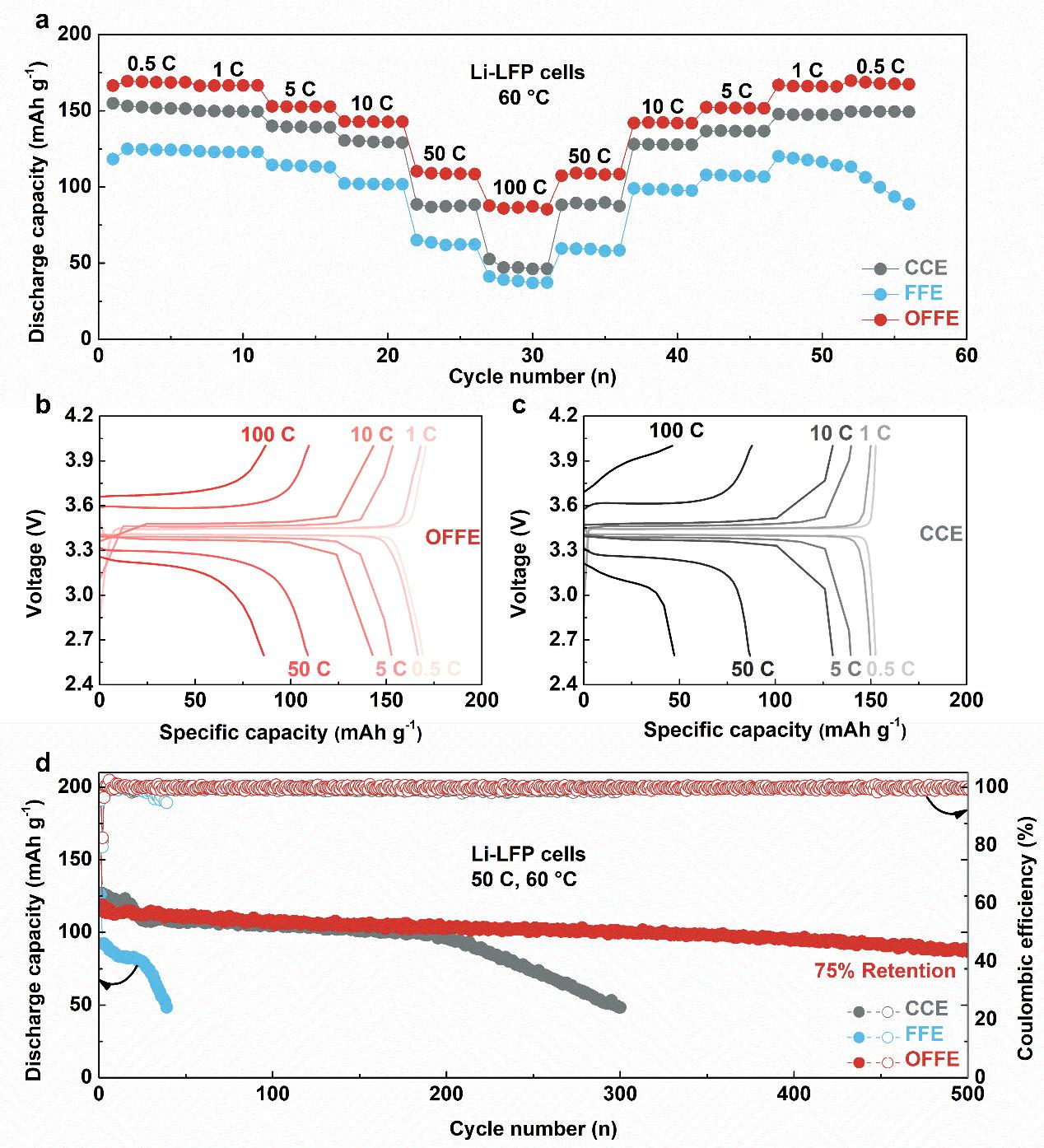 研究发现,基于OFFE的Li-LiFePO4无氟电池在高温条件下具有优异的倍率性能和循环稳定性,可实现100 C极快充电能力(即充电时间仅需36秒),放电比容量为85.9 mAh g-1;在50 C条件下可以稳定循环超过500次,容量保持率为75%。实验证实了LiF并非是电池稳定性的唯一选择,为安全实用锂金属电池提供了全新发展路径。这不仅为锂负极界面化学提供了新见解,还为开发低成本和快充锂金属电池提供了可靠依据,极大地推动了无氟环保型锂金属电池的实用化进程。