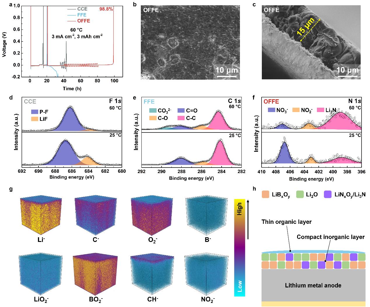 本研究基于新型无氟电解液(OFFE,即1M LiBOB + 0.5M LiNO3 in DME)搭配无氟粘接剂(LA133),开发出兼具绿色环保、高温稳定性及快充性能的无氟锂金属电池。基于综合性能分析与理论计算结合可得,上述性能改善主要归因于无氟电解液高的体相电导率以及原位形成了高稳定、快离子传输的无LiF固体电解质界面。基于OFFE的Li-Cu半电池在60 ℃,3 mA cm-2/3 mAh cm-2的测试条件下具有高达98.8%的库伦效率,并形成致密的锂沉积形貌。如图所示,XPS和TOF-SIMS表明,OFFE能够在锂负极表面生成稳定的无LiF界面,该界面主要成分包括LiBxOy,Li2O和LiNxOy/Li3N,形成的B/O/N复合界面具有优异的稳定性和快速锂离子传输能力,从而实现锂离子的均匀沉积。