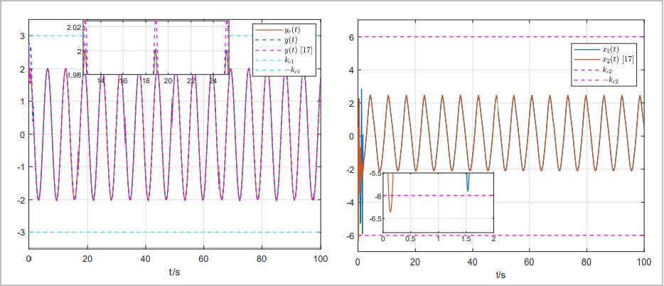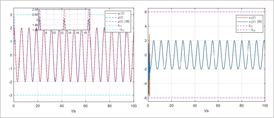 团队针对一类具有状态约束下的不确定高阶严格反馈非线性系统,采用一种新型的基于模糊逻辑的自适应调节技术来辨识系统的不确定性和未知虚拟控制系数。通过设计一种带有自适应参数调节的非线性滤波器,消除在反步控制设计过程中由于重复微分引起的复杂计算问题,将自适应技术与积分函数相结合,以模糊逻辑控制算法解决了在全状态约束前提下的系统渐近跟踪控制难题。针对当前有关全状态约束控制的研究问题取得了有界跟踪结果,结合Lyapunov理论分析和对比仿真验证,均得到了系统全状态约束下渐近跟踪性能,仿真结果如图所示。研究结果进一步推动了具有状态约束的复杂非线性系统实际应用,为模糊控制和自适应滤波控制学习提供新的思路和方法。