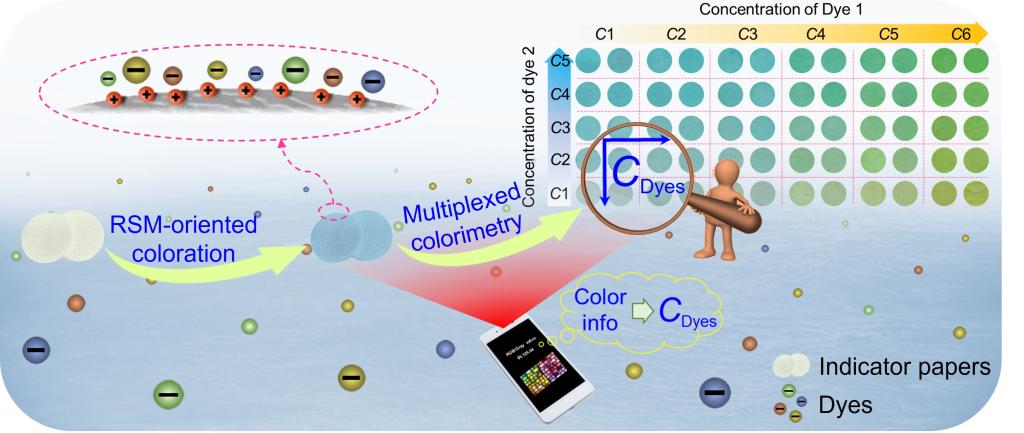 团队以低成本滤纸为基底,采用硅烷偶联剂在水相中的脱水缩聚一步制得试纸,系统研究了试纸的微观形貌、理化性质、着色机理和染料吸附性能及其影响因素。采用RSM对染料提取和比色分析的工艺变量进行了统计建模和优化,在原本需上百次试验的情况下,仅通过8次试验便获得了多路比色分析的最佳条件组合,大幅减少试验次数。在RSM优化的比色条件下,通过多种染料在不同剂量组合下共染制得多路比色卡,着色试纸与比色卡在不同维度对比实现多染料同步可视化检测;利用智能手机APP提取着色试纸和比色卡的颜色信息,构建多种数字化图像分析模式,保障比色分析的可信度。以市售着色饮料和模拟色度污水为实际样,在RSM预测条件下实现了多染料同步可视化快检,分析全过程仅需1-3 min,且检测结果与实际加标量和高效液相色谱法等仪器测定结果均高度吻合。上述研究结果为高效、可靠的多组分可视化快检平台的设计提供了参考,相关工作发表在《Journal of Hazardous Materials》。