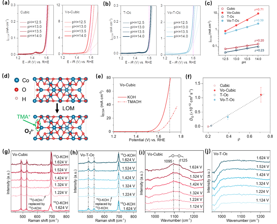 本研究首先合成了暴露(001)面的立方体Co3O4,以及主要暴露面为(111)的截断八面体Co3O4,并在其表面引入氧空位。研究结果发现,产生氧空位后,Co3O4(001)面具有优异的OER活性,其起始过电位为298 mV,明显优于暴露(111)面的Co3O4(335 mV)。系统的电化学表征、化学探针、原位光谱耦合同位素实验以及理论计算结果表明,因氧缺陷的引入,Co3O4的(001)晶面由吸附演化机理(AEM)转变为晶格氧氧化机理(LOM),突破了线性标度关系的限制,具有更高的OER活性,而(111)晶面仍遵循AEM机理。该研究成果为通过在特定晶面引入缺陷提高催化剂电解水制氢效率提供了新的研究思路。