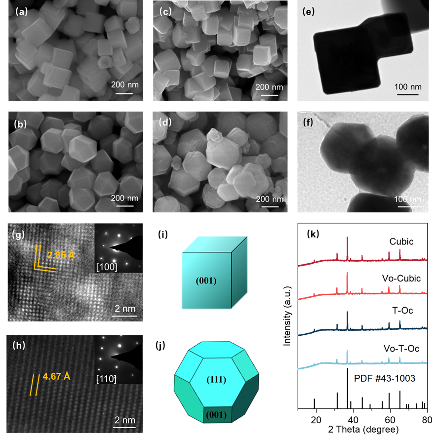 材料的原子排布各向异性导致材料的电导率、极化率、电学性质等各向异性,使得不同暴露晶面的原子结构、能级结构和表面能等存在差异。这些差异对于催化剂活性位点的电子结构和本征催化活性有着重要的影响。目前,研究发现尖晶石Co3O4的OER活性对其暴露晶面具有依赖性。除了原子排布之外,氧空位的引入可有效改善Co3O4的电子结构和OER活性。因此,探究在Co3O4不同晶面上引入氧空位对其OER活性及催化机理的影响,对开发高性能钴基电催化剂具有重要意义。
