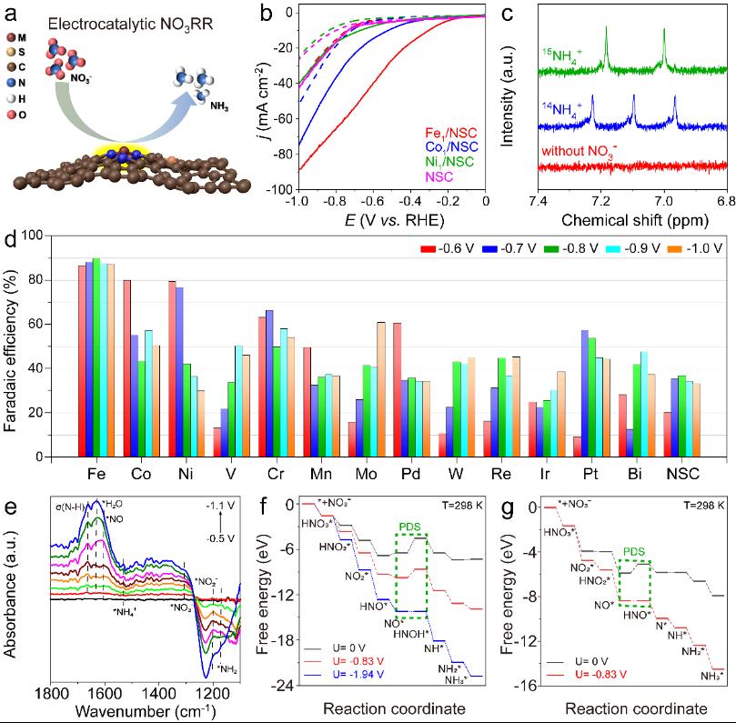 本研究提出了一种基于异电荷耦合效应(HCCE)新策略,其利用质子化聚合物前驱体的正电荷与金属离子的负电荷之间的静电相互作用,构建了17种单原子位点材料,实现了金属中心从一元到多元金属活性中心的可控调节。此外,该方法还能实现单原子位点材料的宏量合成,一次可以实现50克级可控合成(以Fe1/NSC为例)。团队进一步以电化学硝酸根还原为模型反应,选取一元金属单原子位点(M1/NSC,M = Fe、Co、Ni、V、Cr、Mn、Mo、Pd、W、Re、Ir、Pt、Bi等)催化剂,系统评价了其在电化学硝酸根还原反应中的性能,利用原位衰减全反射傅里叶变换红外光谱(ATR-FTIR)和密度泛函理论(DFT)计算,揭示了Fe1/NSC催化剂在硝酸还原反应中的催化机制和活性来源。结果显示,以Fe1/NSC为阴极组成Zn-NO3−概念性电池器件具有高功率密度和很好的稳定性,该研究为氮氧化物资源高效利用与能量供给耦合提供了有益的探索与实践。