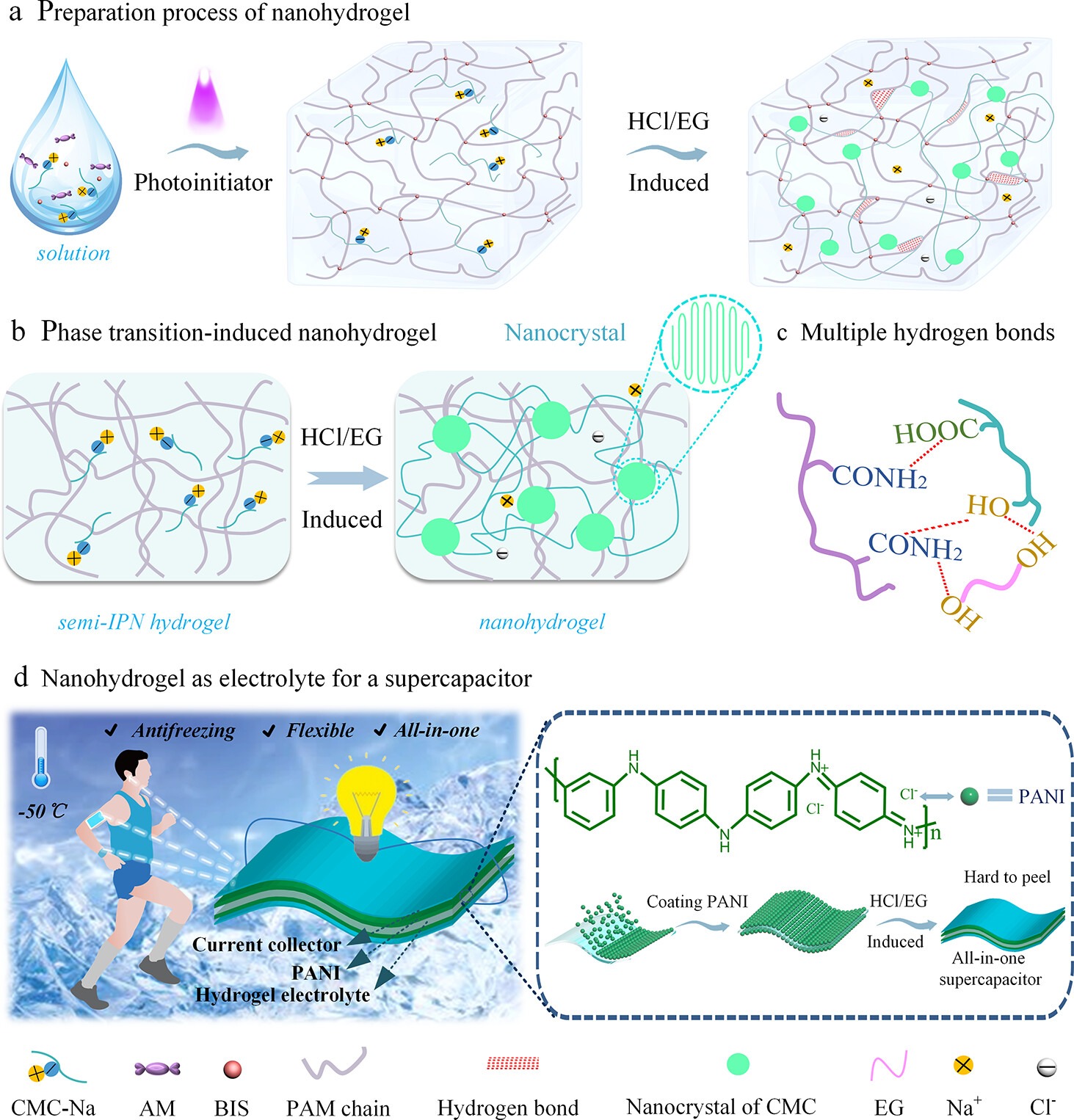 本研究将短链羧甲基纤维素钠(CMC-Na)引入化学交联的聚丙烯酰胺(PAM)单网络体系中制备了半互穿 (Semi-IPN)水凝胶。采用简单诱导方法用HCl/EG溶液诱导Semi-IPN中的CMC-Na原位生成羧甲基纤维素(CMC) 纳米晶体来增强强度。结果显示,纳米水凝胶电解质的韧性提高了60倍,而断裂伸长率提高了3倍。纳米水凝胶还具有较好的粘附性能,可以更好的与电极结合,CMC-Na与HCl反应产生的NaCl可作为电解质。利用溶剂、盐等多种协同作用,使纳米电解质的冰点降低至-80℃,即使在低温环境也具有柔韧性,应用于柔性一体化超级电容器。该超级电容器无论是在多种形变还是低温环境都具有优异的电化学性能。超级电容器经历过15000次循环后,电容仍能保持97%,即使在-50 ℃环境下也可以点亮2.5 V的LED灯。此项研究为纳米水凝胶电解质作为可穿戴超级电器容器提供了一种崭新的思路,拓宽了基于一体化超级电容器的可穿戴设备在极端环境中的应用。