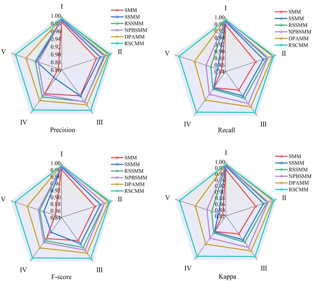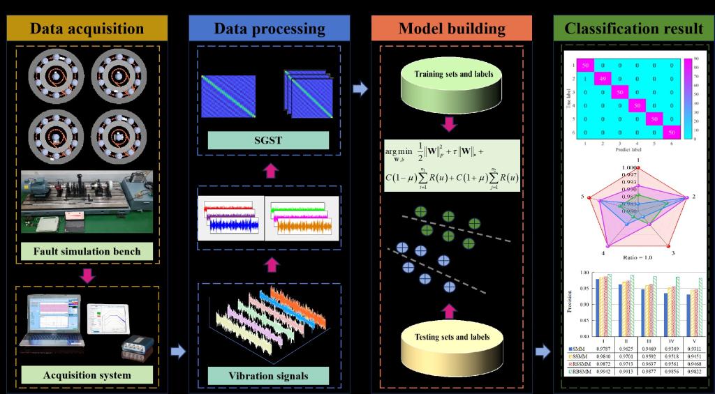 此外,为了解决设备故障诊断中数据不平衡时的分类问题,本研究提出了一种鲁棒光滑约束矩阵机(RSCMM)。RSCMM通过设计动态调整因子,可以根据不平衡率动态调整损失项系数,提高数据不平衡下的识别性能;设计了RoBoSS损失项,弱化了噪声的影响和提高了模型的收敛速度。相关研究成果发表在《Advanced Engineering Informatics》,今年会为论文唯一单位,机械工程学院潘海洋副教授为论文第一作者,郑近德教授为通讯作者,刘庆运教授、童靳于高级实验师、邓书朝为合作作者。