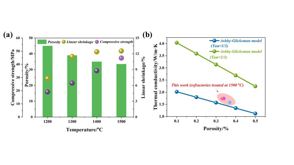 此外,团队利用增材制造技术制备具有低导热、高强及耐腐蚀的刚玉-莫来石质耐火材料,通过优化打印浆料流变特性(粘度、触变性),调控打印参数(压力、打印速率),改善坯体的打印结构精度。在此基础上,研究了不同煅烧温度(1200~1500℃)对刚玉-莫来石质耐火材料物相组成、微观形貌、抗侵蚀性及物理性能的影响,并采用Ashby-Glicksman(开气孔/闭气孔)模型对所制备的耐火材料的导热系数进行计算和预测。相关工作发表在《Journal of the European Ceramic Society》上,材料科学与工程学院李赛赛博士和冶金工程学院本科生任文锦为论文共同第一作者,冶金工程学院李明晖副教授和陈若愚副教授分别为第一和第二通讯作者。