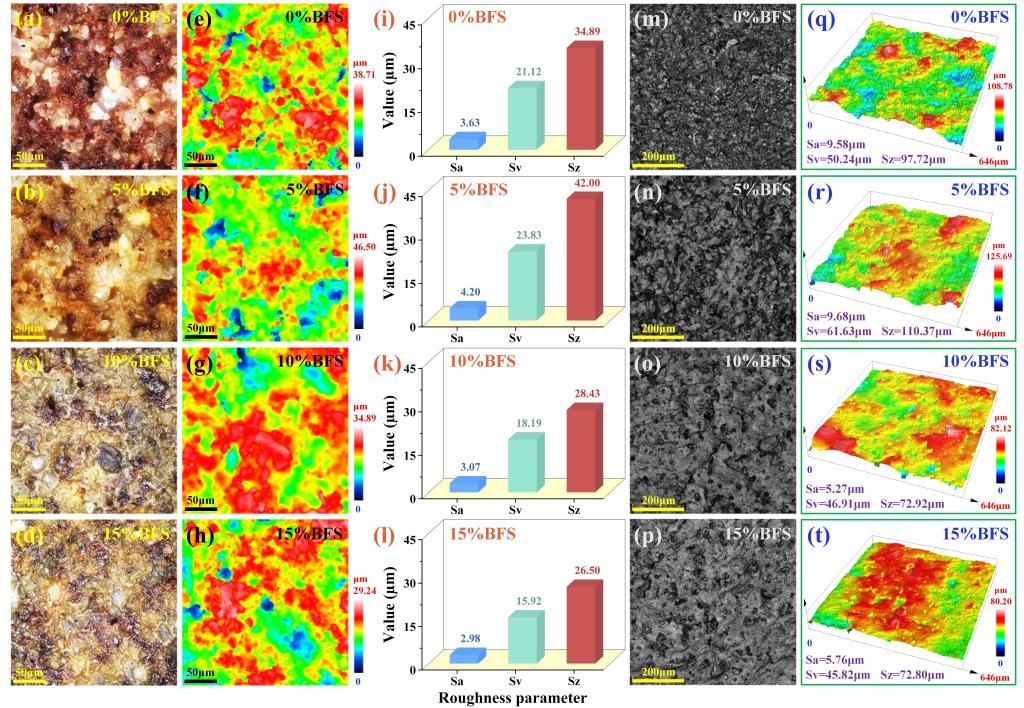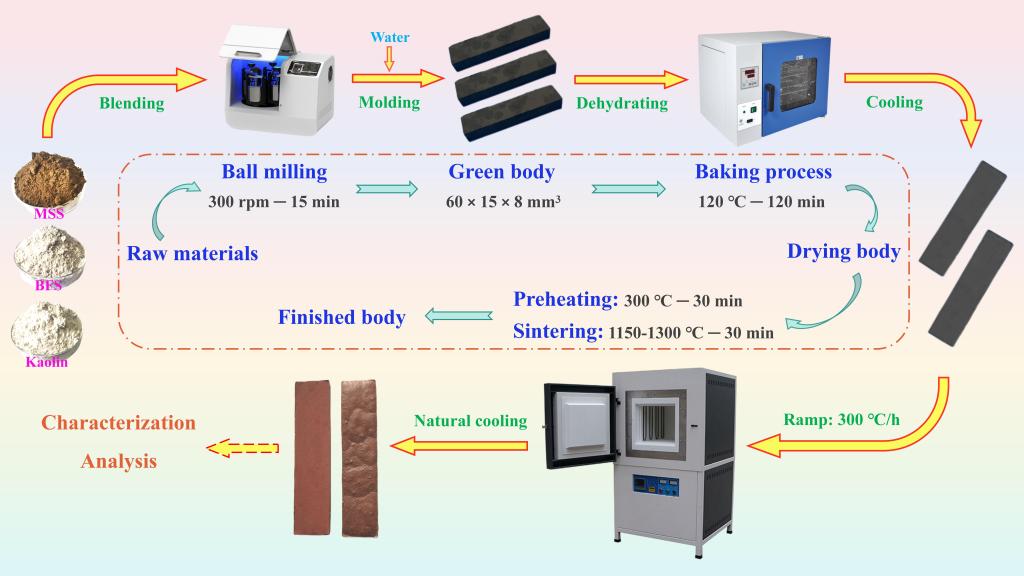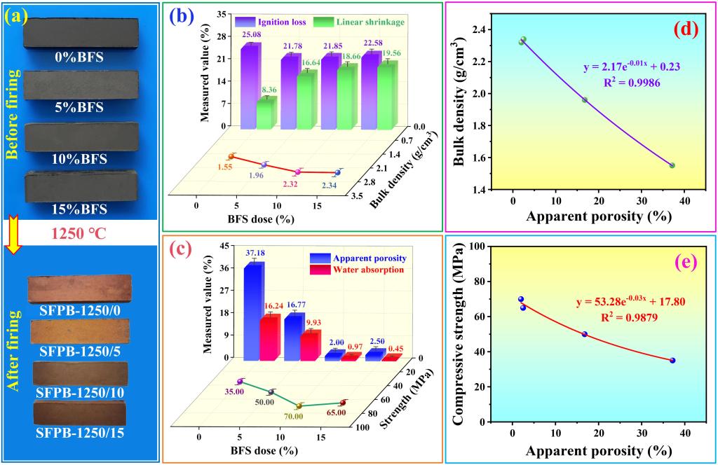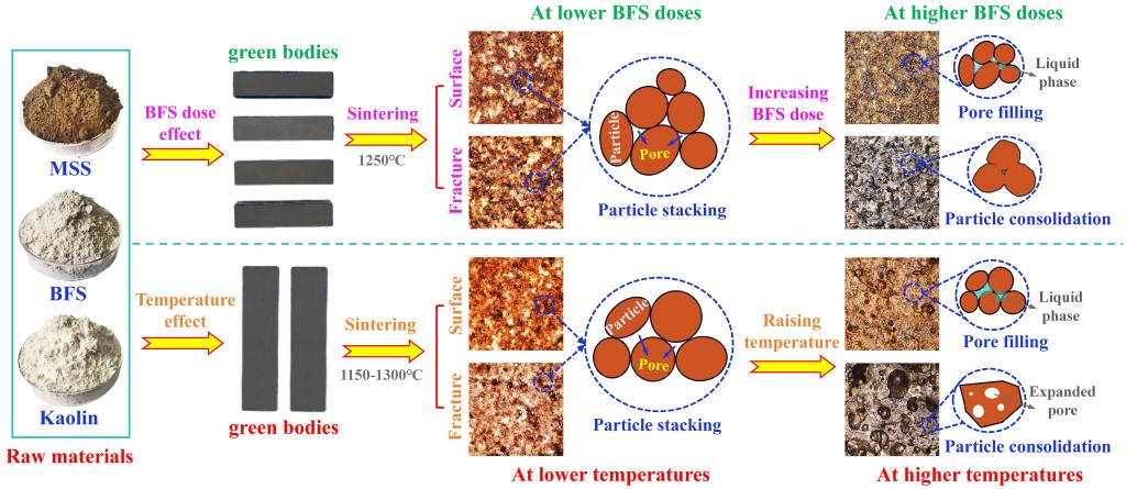 团队创新性地将高炉渣和城市污水污泥作为天然黏土的可行替代品掺入到高岭土中合成了一种自发泡多孔砖,系统讨论了高炉渣剂量对于多孔砖外观形貌、理化性能(尤其是表观孔隙率、吸水性和抗压强度)以及微观结构和孔隙演变的影响,并在最大高炉渣剂量的基础上,进一步分析了烧结温度对于多孔砖理化性能、气孔结构、矿物相组成、玻璃化和致密化过程的影响,揭示了在不同烧结温度和高炉渣剂量下多孔砖样品的烧结机制,优化了多孔砖的生产工艺和原材料选择,证明了城市污水污泥和高炉渣协同生产多孔砖是可行的。本研究在实现冶金固废高值化利用的同时促进了多孔砖工业的可持续发展。
