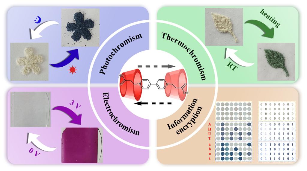 近年来,能够对外部刺激(例如光照、温度、电场、磁场、pH值和压力等)进行响应的变色材料引起了广泛关注,在智能窗户、电子显示器、存储设备、光学开关和化学传感器等方面有较好应用前景。目前的刺激响应变色材料,大多数仅可以对单个或两个外部刺激产生响应,对于具有多重刺激响应变色行为的材料的研究还相对有限。然而,某些特定的应用,如多重防伪和多层级信息加密,则要求同一材料能够响应三种或更多种外界刺激而产生变色。因此将多个官能团整合到同一个化合物中并构建多重刺激响应的变色材料仍然具有挑战性。