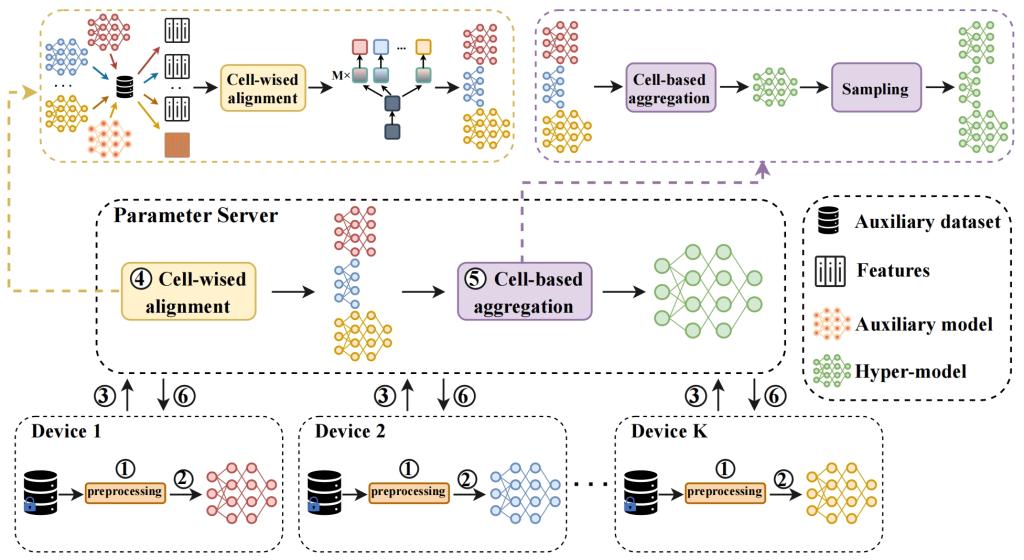 针对上述问题,团队提出了一种面向异构物联网的自适应本地个性化模型构建联邦学习方案(FedASA),为每个设计了基于Cell的模型架构,设计Cell-wised对齐方法自适应的构建本地个性化模型,设计Cell-based聚合方法自适应的聚合异构的上传模型架构。团队对联邦误差上界和公平性进行了理论分析,为模型收敛提供了理论保证,并在真实数据集上进行了广泛实验。研究结果进一步推进了联邦学习在移动边缘计算领域的实际应用,为资源受限的异构物联网环境下跨设备数据协同学习提供新的思路和方法。