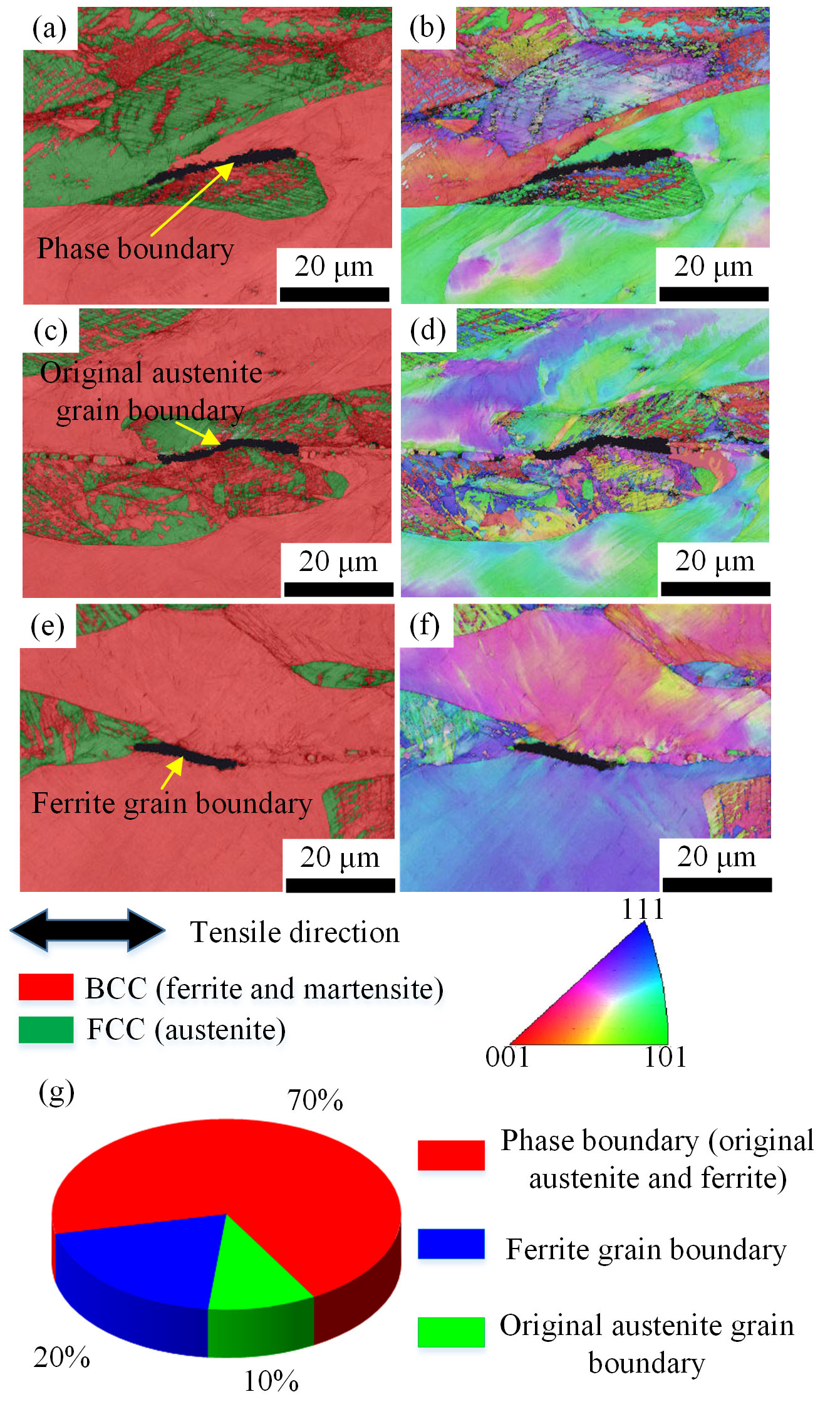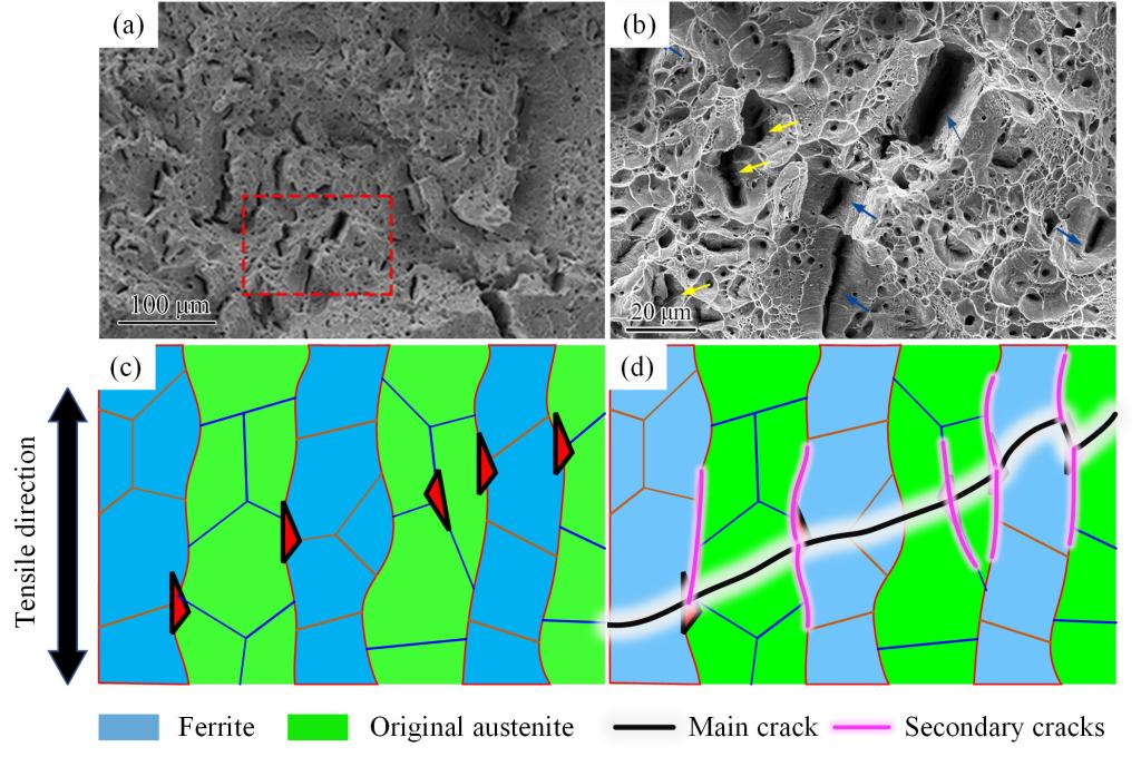 研究聚焦于Mn-N合金化双相不锈钢,通过降低镍含量并有效利用相变诱导塑性(TRIP),显著提升了材料在变形过程中的塑性和强度。这种新型的TRIP型双相不锈钢(TDSS)有望克服传统双相不锈钢成形时面临的塑性不足、硬化能力低等问题,成为一种极具发展潜力且成本效益高的高性能结构材料。然而,由于钢中存在三相(即残余奥氏体、铁素体以及马氏体)混合形成的复杂微观结构,导致不均匀性的变形行为及其相关损伤机制变得尤为复杂。因此,深入理解不同类型界面(包括铁素体/奥氏体、铁素体/马氏体、奥氏体/马氏体的相界及各相内部的晶界)上的损伤演化规律对于预测其他两相或多相材料的成形性能具有重要意义。