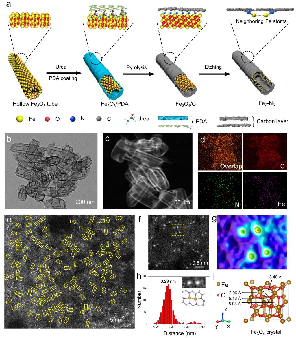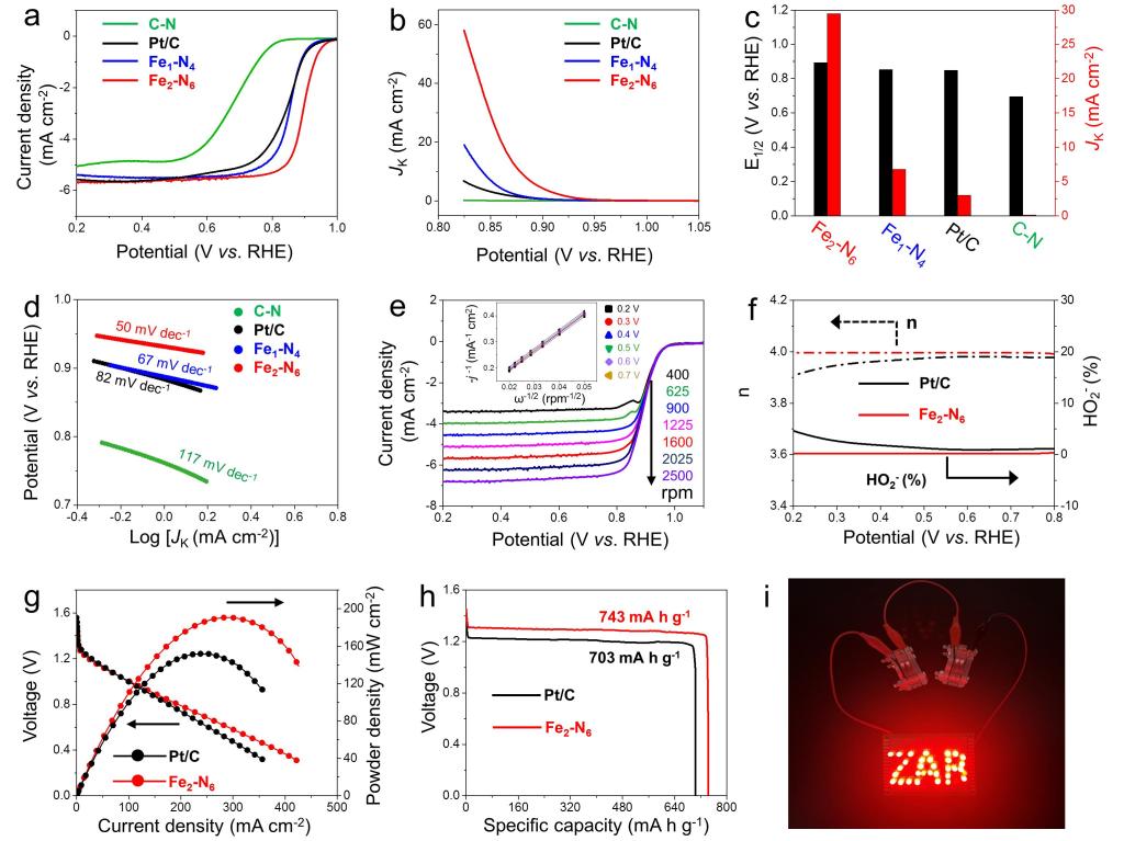 团队创造性地将化学刻蚀和氮源锚定的方法相结合,制备出高纯度的双原子铁催化剂,借助界面锚定策略实现了对相邻两个铁原子之间距离的精准调控。研究人员将该方法拓展应用到一系列非贵金属催化剂中,实现了包括铁、铜、钴、镍、锌、锰等多种非贵金属双原子催化剂的制备;将双原子铁催化剂应用在锌-空气电池的正极,用以替代传统的铂金属催化剂。结果表明,这种双原子铁催化剂表现出优异的催化活性、耐复杂环境能力和长时稳定性。用这种双原子铁催化剂组装的锌-空气电池,展示出高达190.6 毫瓦每平方厘米的最大功率密度,显著优于传统铂催化剂组装的电池(151.7 毫瓦每平方厘米)。