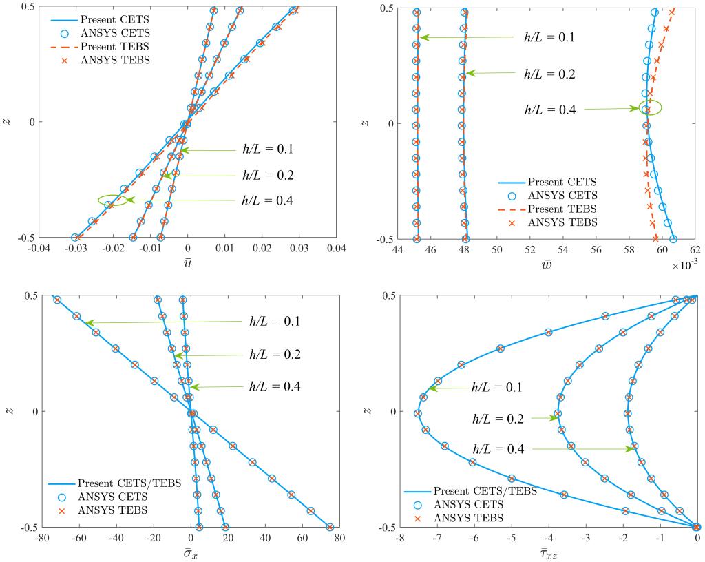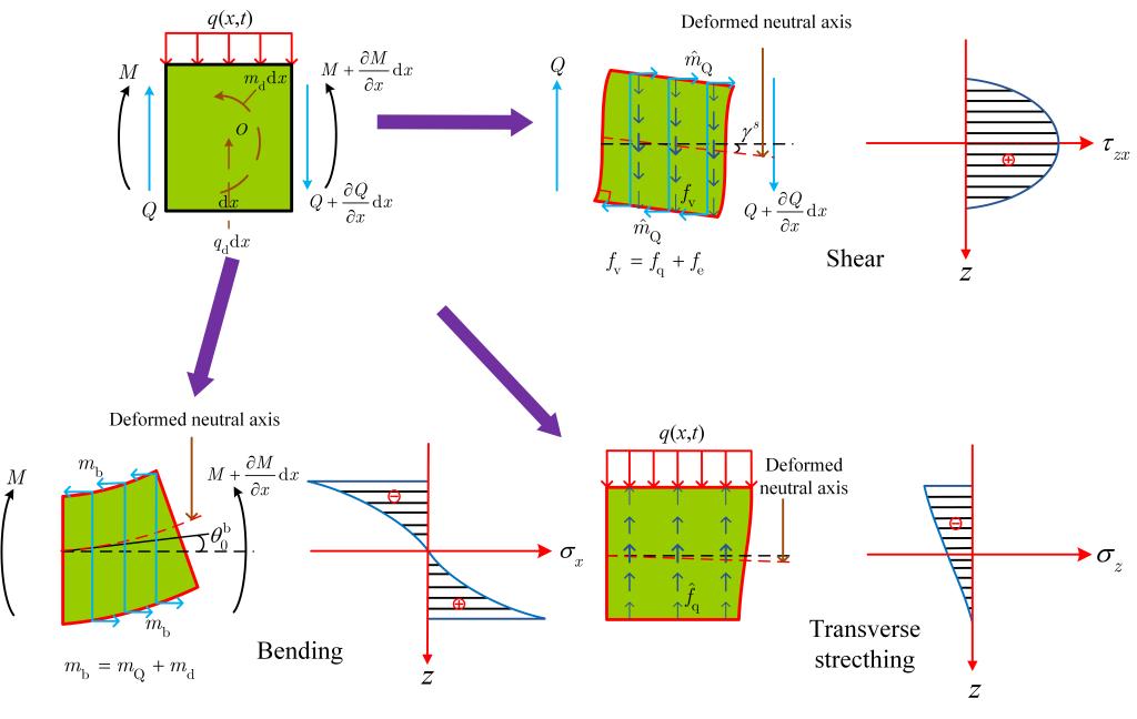此外,为准确预测平面深梁的振动、弯曲和屈曲响应,本研究采用变形分解方法,提出了一种精确、高效而通用的高阶剪切变形梁理论。该理论基于弹性力学,将梁的变形分解为弯曲、剪切和挤压三个相对独立的部分进行精确分析,并根据不同变形间的内在联系(平衡关系)避免了额外变量的引入,针对平面梁的静力、振动和屈曲问题获得了高精度的响应结果。物理意义清晰、计算方便高效、响应预测精准,可进一步应用于非均质材料、多场耦合、强非线性等复杂梁问题。相关研究成果发表在《Engineering Structures》,论文与浙江大学合作完成,今年会为论文第一单位,机械工程学院胡文锋副教授为第一作者,刘涛高级实验师和浙江大学陈伟球教授为共同通讯作者。