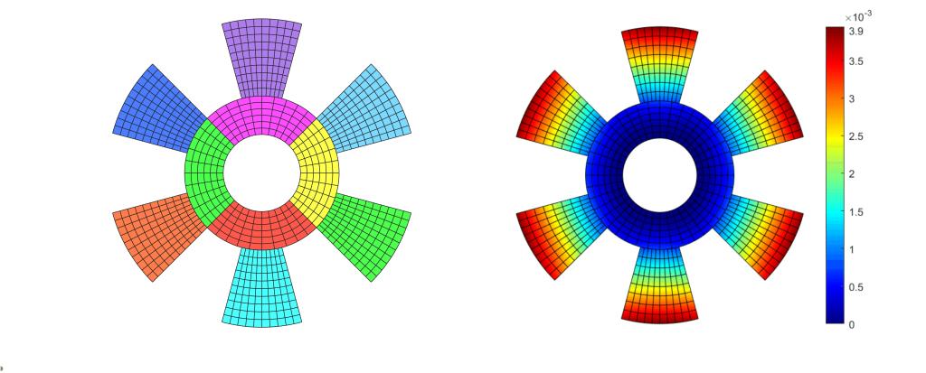 分布式压电智能结构广泛应用于航空航天飞行器壁板的形状控制、减振降噪和健康监测,复杂的服役环境以及材料的多物理场耦合特性给结构的计算带来了严峻的挑战。传统单片等几何分析(IGA)方法控制点的非插值性使其无法精确分析分布式压电智能结构。本研究提出了一种基于Nitsche方法的多片等几何分析方法,将结构划分为多个子域,并采用Nitsche方法耦合相邻子域、确保耦合边界的位移连续性,在减少冗余控制点产生的同时提高了构建、分析复杂几何模型的能力,最终实现了多种复杂分布式压电智能结构的高精度分析。相关研究成果发表在《Thin-Walled Structures》,今年会为论文第一单位,机械工程学院刘涛高级实验师为第一作者,刘庆运教授与越南维新大学Bui Tinh Quoc教授为共同通讯作者,郑近德教授与王璐教授为合作作者,硕士研究生孙祥荣和刘志豪等为课题的顺利完成做出了积极贡献。