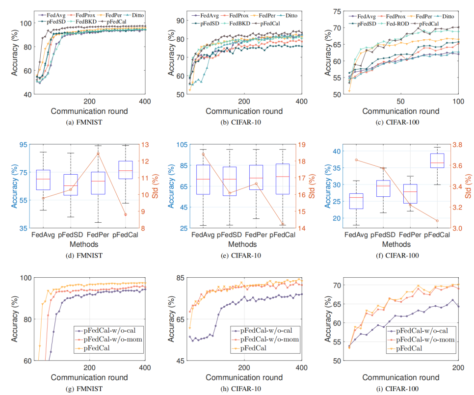 (pFedCal算法在精度、公平性上的性能比较)