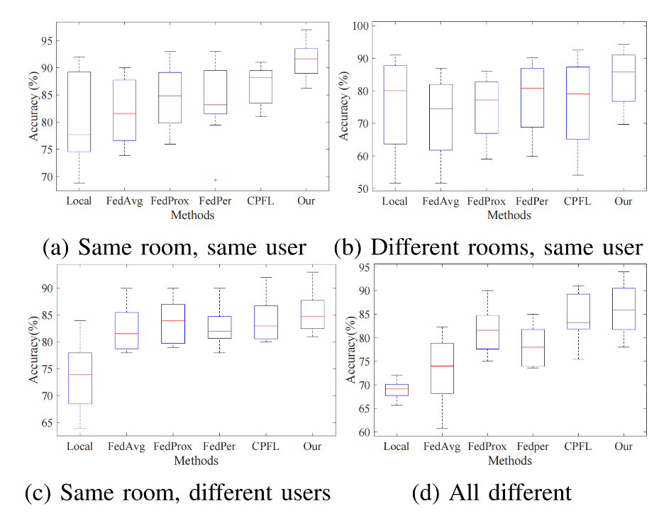 针对分布式客户端数据的异构性导致相同任务在不同客户端的特征分布差异显著问题,团队提出FedPMP算法,通过自适应模型分区和个性化模型聚合,针对每个客户端的数据分布定制个性化模型。FedPMP将模型分为全局共享组件和本地个性化组件,前者捕捉跨用户群体的通用特征,后者提取用户特定的个性化特征。个性化聚合策略根据特征相关性分别整合共享和个性化组件,促进客户端间的协作。实验表明,FedPMP在多个人类活动识别基准测试中有效应对特征漂移问题,平均提升识别准确率5%,并显著降低客户端间准确率的方差,展现了其高效性和鲁棒性。