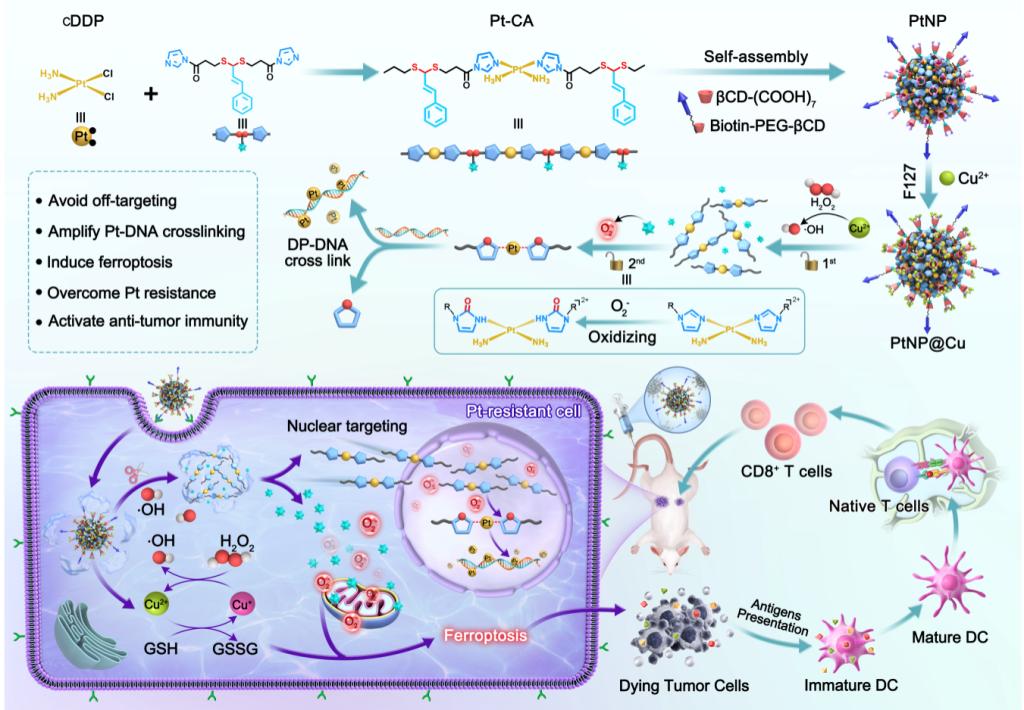 铂类药物的疗效常受限于低利用率、副作用及铂耐药性。本研究开发了一种双锁保护的Pt(II)纳米药物PtNP@Cu,其通过级联催化-氧化还原反应实现顺铂(cDDP)的解锁,从而在肿瘤细胞核内实现顺铂的原位激活并诱导铁死亡。该设计避免了活性Pt(II)物种在正常细胞或癌细胞胞质中的过早释放,确保Pt-DNA交联的肿瘤特异性最大化。同时,级联反应诱导的谷胱甘肽(GSH)耗竭与活性氧(ROS)生成导致癌细胞铁死亡,进一步减少GSH介导的顺铂解毒作用,克服铂耐药性并增强免疫原性,最终实现高效肿瘤特异性化疗及体内抗肿瘤免疫。此工作为全面解决铂类药物利用率低、副作用及耐药性问题提供了新策略,并为化学-免疫治疗提供了新思路。