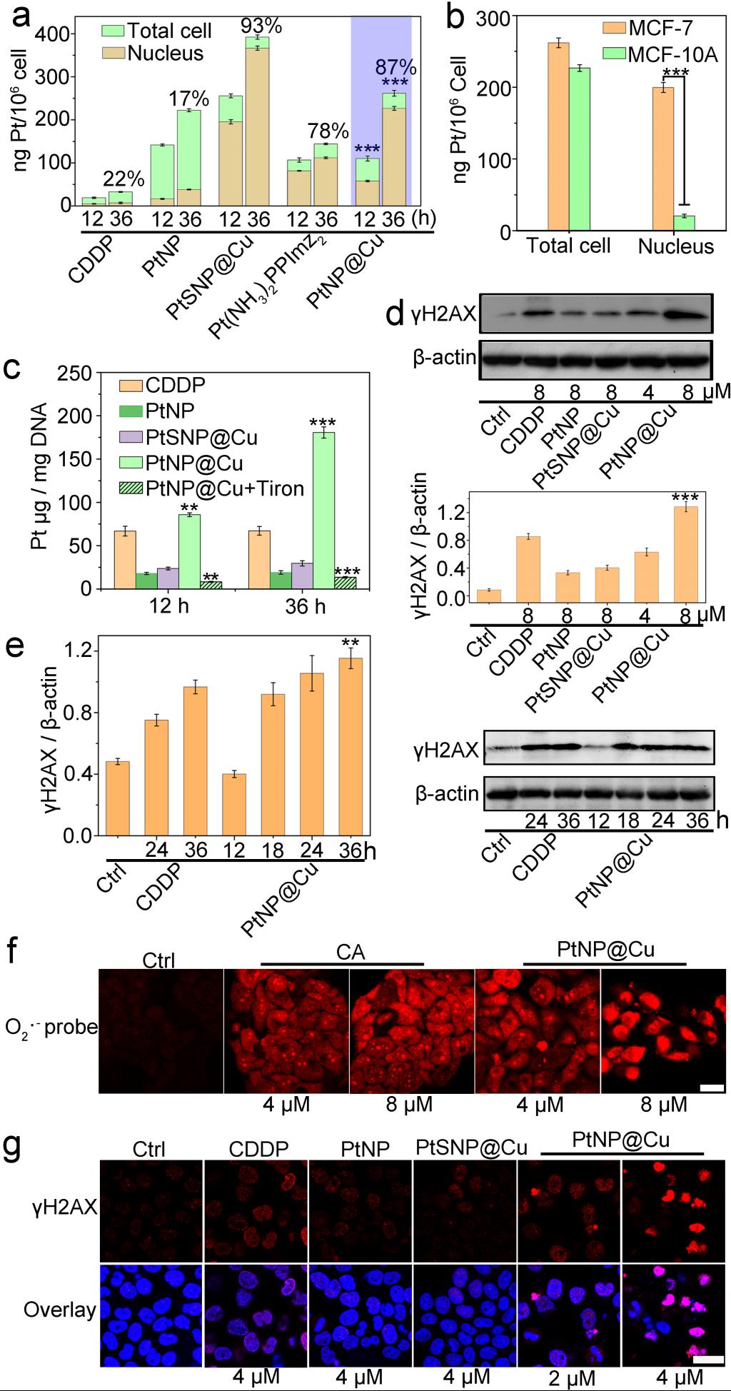 针对癌细胞内环境具有较高水平的GSH(10 mM)和H2O2(100 µM),本研究利用铜离子和GSH以及过氧化氢构建级联催化的体系,不仅可以降低癌细胞内高水平的GSH,并且产生羟基自由基来切割释放铂前药和进一步扩增细胞内活性氧的物质(肉桂醛),进一步通过肉桂醛产生的超氧根来氧化铂前药,达到释放铂药物进行化疗的作用。针对顺铂在细胞核内的占比较少(<20%),核利用率较低等原因,本研究制备了双锁控制释放,并且可以核靶向的铂前药,可以看到铂前药在细胞核内的占比远大于顺铂,并且发挥的和细胞内DNA交联量也大于顺铂,可以起到很好的诱导DNA损伤的效果。