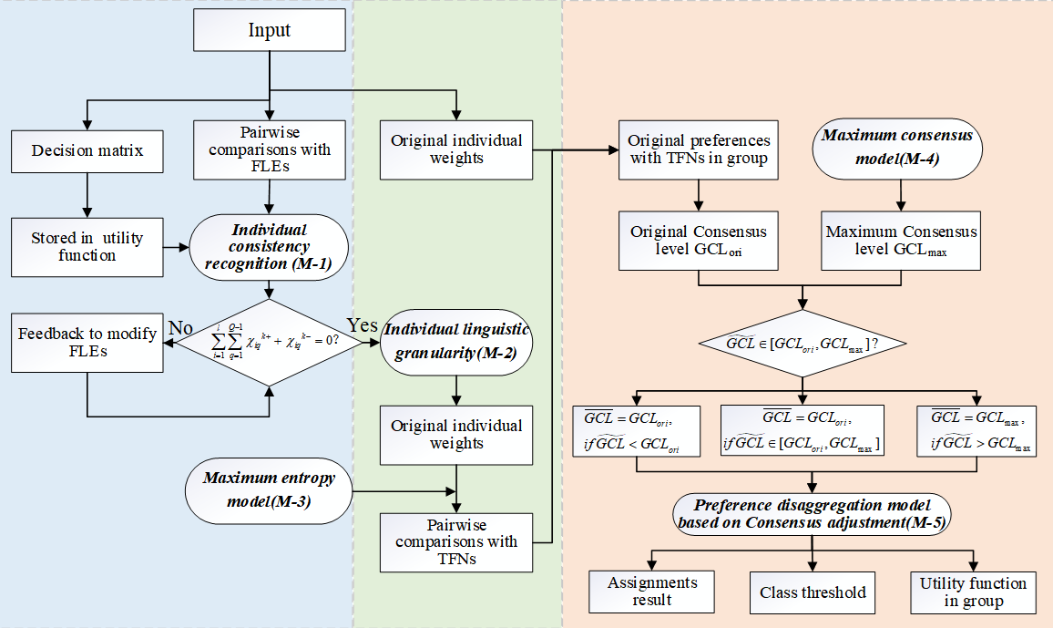 近年来,随着科学技术的发展,现实世界的决策问题日益复杂,传统的决策方法已难以针对这些复杂问题进行建模。为了满足现实需求,多准则群分类问题与建模受到学者们的广泛关注。然而,目前的研究仍面临以下挑战:由于方案类别信息获得的有限性和决策者认知能力的局限性,决策者要提供明确的偏好信息以达成共识就变得十分困难。传统的多准则群分类方法难以处理复杂语言信息,不足以充分利用复杂语言的特征,尤其忽视了语言群决策环境下个性化语义的影响。