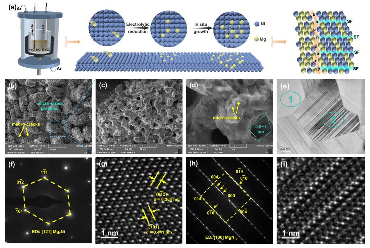 异相界和堆垛缺陷因其独特调节电子结构与d带中心的能力,是提高HER活性的有效手段。然而,由于两者调控机制存在差异,通过温和合成方法将这两种策略融合到一个简单的合成框架中仍存在较大挑战。团队创新性地采用熔盐电沉积策略,在镍基底上原位制备出富含堆垛缺陷的异质Mg-Ni合金(Mg2Ni/MgNi2)。该结构所构建的相界,充当了电子高效输运的“桥梁”,有效调控了电子结构与d带中心,显著提升了HER活性。采用该方法制备的Mg-Ni合金电极在碱性条件下仅需69.2 mV过电位即可驱动高效析氢反应,并在600 mA·cm-2的高电流密度下保持稳定运行。该研究打破了“镁不适合HER”的传统观念,为通过“相工程-缺陷工程”协同策略设计高效非贵金属催化剂提供了全新范式。