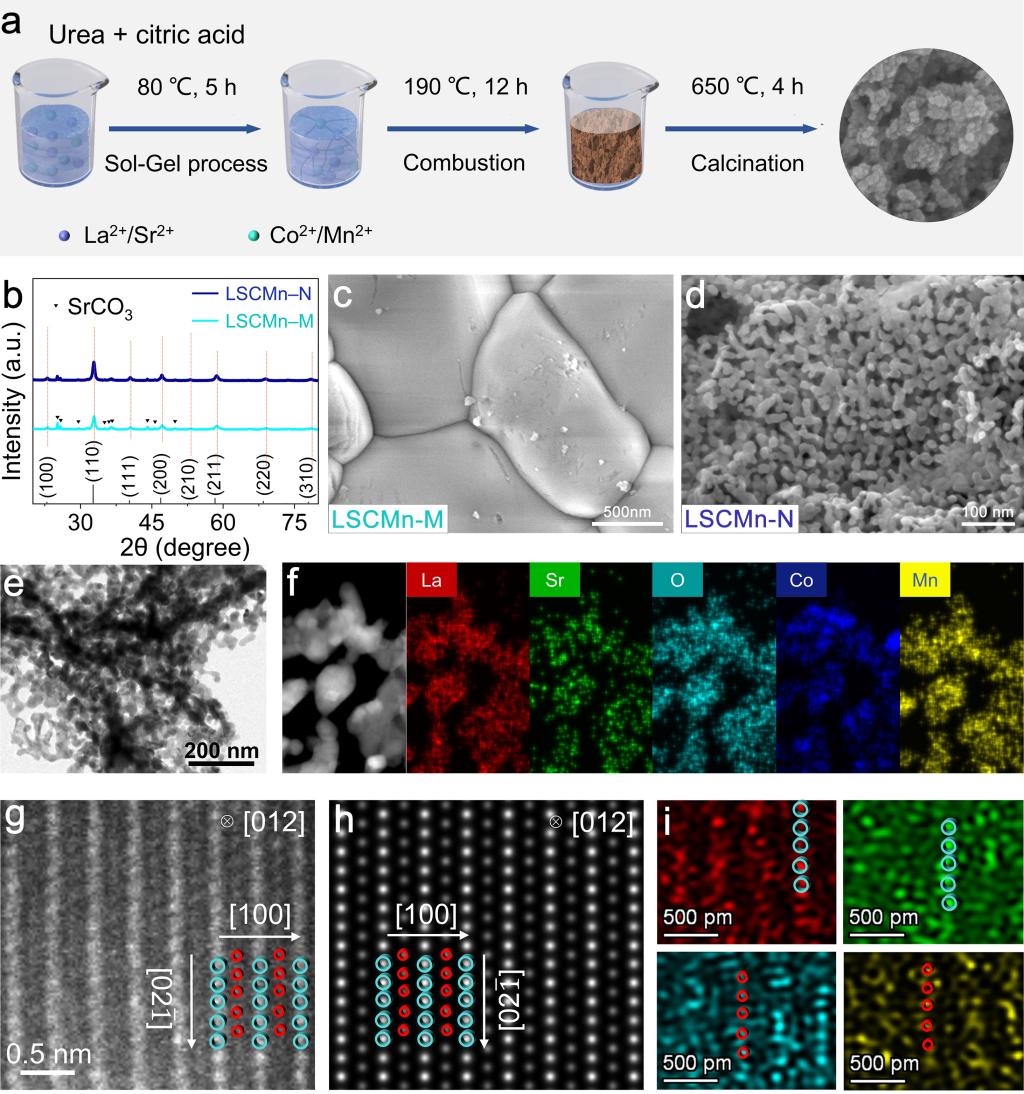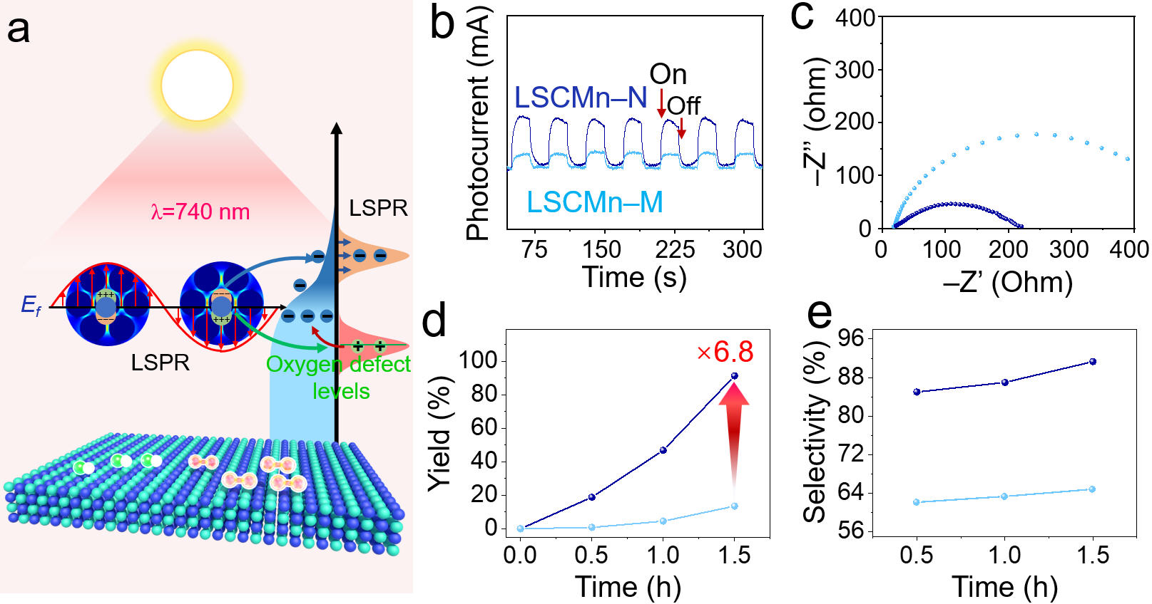环氧化合物是合成医药、农药及高分子材料的重要中间体,全球年需求量逾千万吨。传统烯烃环氧化工艺多以双氧水为氧化剂的均相催化、空气为氧化剂的银-气固相催化为主,通常需高温和/或双氧水等强氧化剂的苛刻反应条件。因此,在此工艺条件下环氧化合物的过度氧化难以避免,导致环氧化的选择性降低。团队利用尿素辅助-氧化还原法开发了新型Mn基催化体系,构建了具有局域表面等离子体共振效应的LaSrCoMnO6催化剂,可在可见光照射及60°C温和条件下活化氧气,生成活性氧物种,实现对苯乙烯的高选择性环氧化。该体系无需有机过氧化物或添加剂,反应后催化剂经离心即可回收,循环使用5次后活性无明显下降。