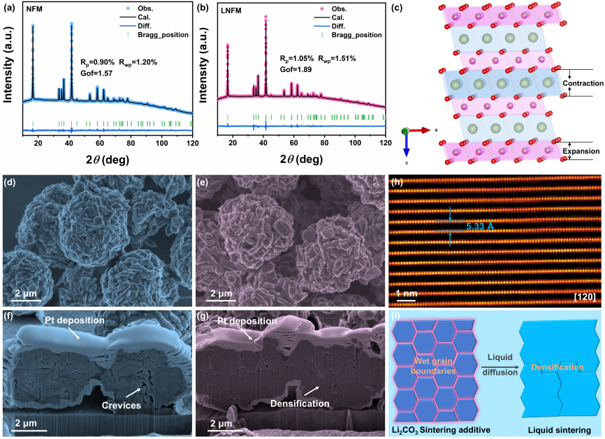 团队借鉴传统陶瓷领域中的液相烧结方法,在多晶正极材料合成过程中引入低熔点共晶液相,其一方面提升了颗粒尺度的致密性,另一方面引入了掺杂剂(Li),起到了“一石二鸟”的作用。此外,研究人员发现,烧结过程中材料的晶格参数的各向异性变化也是导致材料颗粒尺度破碎的重要原因。基于这一设计,研究团队开发的NaLi0.05[Ni1/3Fe1/3Mn1/3]0.95O2多晶正极表现出良好的颗粒致密性,振实密度得到了较大提高,比表面积得到了降低。