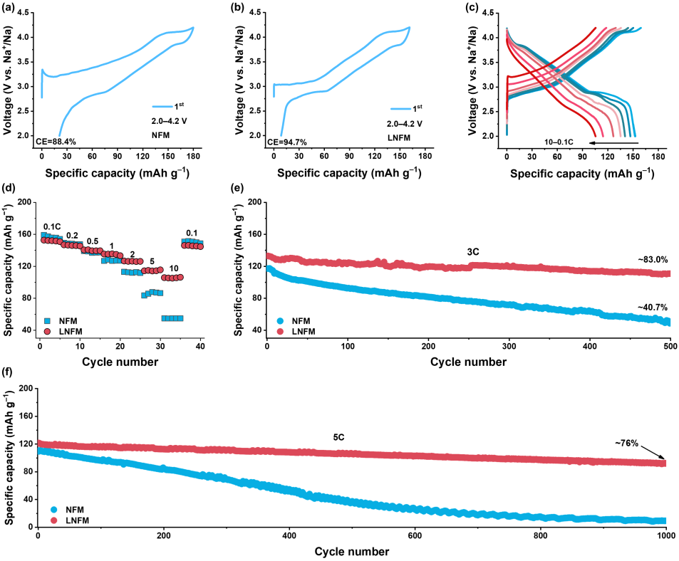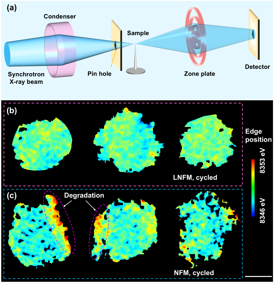 这种改性后的正极材料在高工作电压下展现出卓越的快速充电能力(5C 时为 121.6 mAh/g,仅需12 min即可充到额定容量的百分之八十),并且使用寿命得到极大地提高(1000 次循环后仍保持 76%初始容量)。研究人员通过同步辐射级TXM-XANES连用技术,表征并证实了通过改善材料的颗粒致密结构和降低充放电过程中的晶格应力可以减少副反应并保持高电化学活性,最终实现了快速充电、长寿命和高电压的钠离子电池。