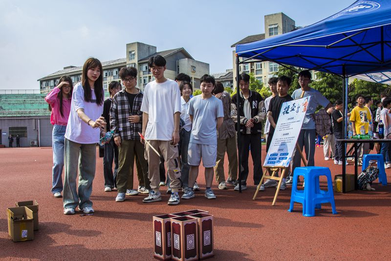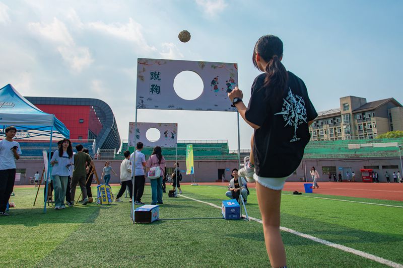 传统民俗趣味运动会中,蹴鞠场上同学们身手矫健,配合默契,灵活的脚步、精准的射门,他们沉浸其中,感受这项传统运动的魅力。射箭场上同学们自发组成的队伍进行激烈对抗,他们屏息凝神,瞄准目标,直中靶心。袋鼠跳、同舟共济、投壶、踩气球等游戏现场气氛更是火爆又热烈,欢笑声、加油声在田径场此起彼伏。